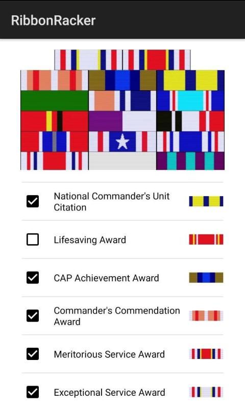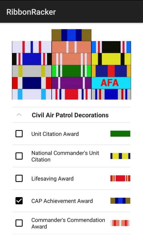 Build a ribbon rack for Civil Air Patrol Awards and Decorations live on your Android device. Ribbon Racker allows you to select specific ribbons and place them in the correct order instantly.