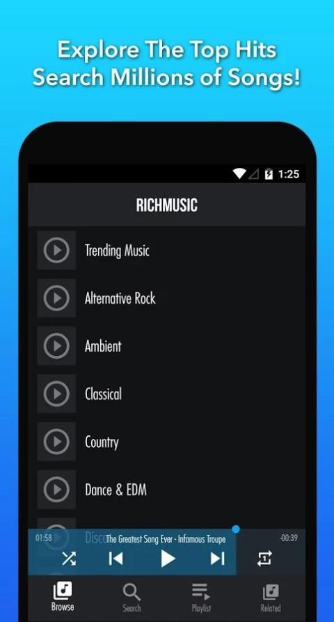 Disclaimer: Hal ini tidak gratis mp3 musik downloader aplikasi dan tidak memungkinkan Anda untuk men-download musik gratis untuk mendengarkan secara offline tanpa WiFi. RichMusic hanya stream hukum lagu bebas royalti dan dapat TIDAK mp3 musik download atau tembolok sebagai downloader musik gratis. Untuk informasi lebih lanjut, silakan lihat Persyaratan Layanan dalam aplikasi.