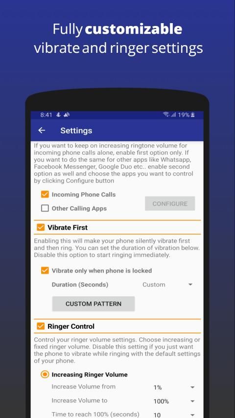 Ring Master automatically increases your ringtone gradually so that you can avoid sudden shocks from loud ringtones. Set the amount of volume you want to increase and Ring Master will take care of the rest. You can even set it to
