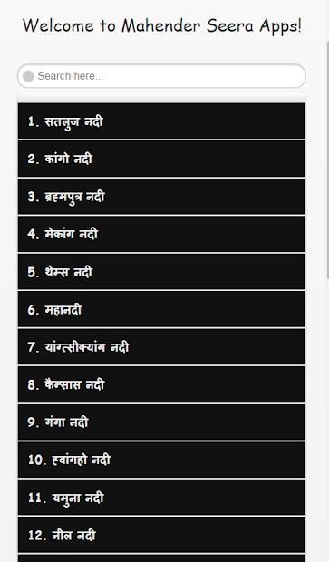 इस एप्प में विश्व की संपूर्ण नदियों की जानकारी हिंदी में प्राप्त कर सकते हे।