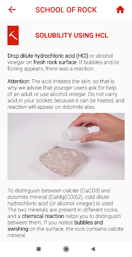 Aplikasi RockCheck adalah kunci identifikasi untuk batu. Ini adalah alat bantu pengajaran yang dapat digunakan untuk berkontribusi pada pengajaran konten geologis dalam mata pelajaran sains alami dalam sistem sekolah formal. Aplikasi RockCheck juga dapat digunakan oleh semua organisasi sosial yang berminat dalam pendidikan non-formal dan penggemar geologi lainnya. Konten didasarkan pada klasifikasi standar batuan dan disesuaikan dengan kebutuhan masyarakat umum. Aplikasi RockCheck terdiri dari tiga bab utama: kunci batu, ensiklopedia dan sekolah rock. Dalam tombol ROCK, dengan menjawab pertanyaan ya / tidak, Anda mendefinisikan nama batu yang dipilih. Saat menjawab pertanyaan, Anda dapat membantu diri sendiri dengan tautan yang berwarna oranye dan memberikan penjelasan tambahan tentang konsep dan prosedur geologi di sekolah rock. Jawaban yang benar membawa Anda ke ensiklopedia di mana Anda dapat mempelajari lebih lanjut tentang batu secara umum, tentang penampilan, formasi, dan penggunaannya.