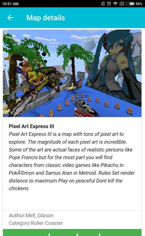 Pixel Art Express adalah sebuah petualangan ke dunia minecraft pixel. Ada banyak wajah sebenarnya dari orang yang realistis dibuat dalam gaya seni pixel dan Anda perlu melakukan perjalanan melalui itu. Peta pertama yang harus Anda men-download jika Anda ingin mencoba roller coaster minecraft.