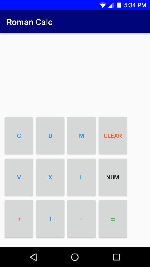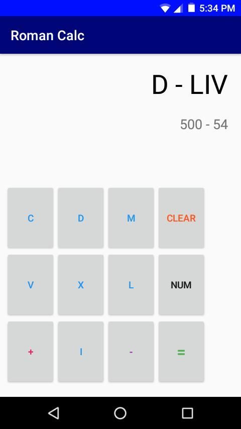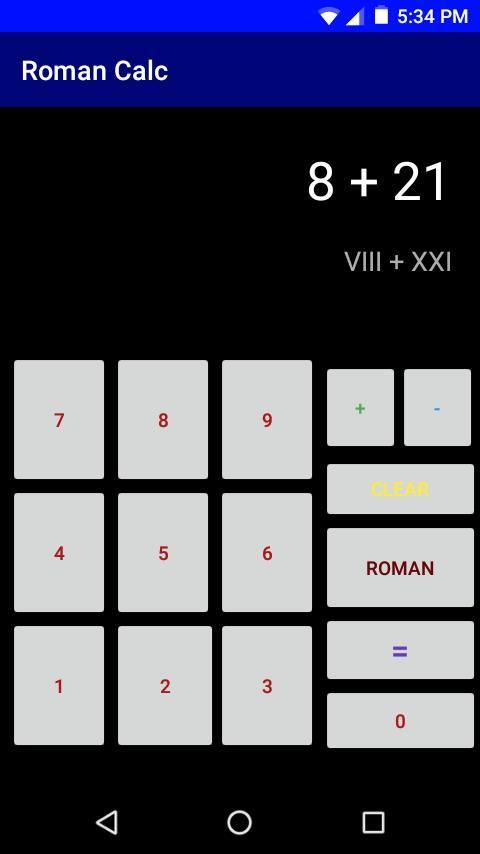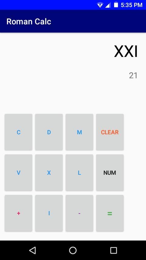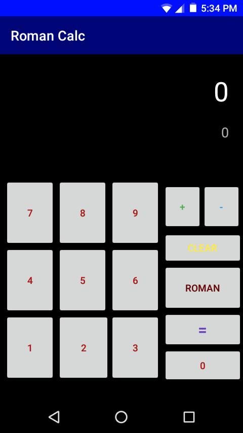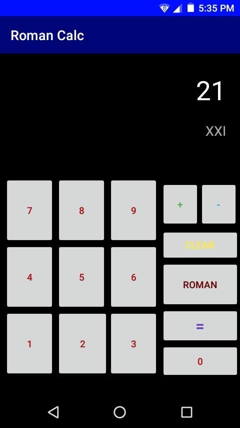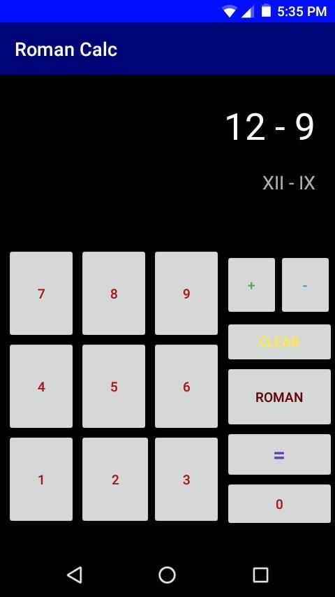 A simple calculator that can easily convert roman numerals to numbers and vice versa! Also has addition and subtraction functions that can subtract or add any two roman numerals / numbers. To clear the output in the display, simply click "CLEAR". To switch from the number pad to the roman numeral keys, click "ROMAN". To revert back to the number pad, click "NUMBER". Please enjoy this app and don't forget to give a review and rating! Feel free to share this app with other people. Thank you for installing this app!