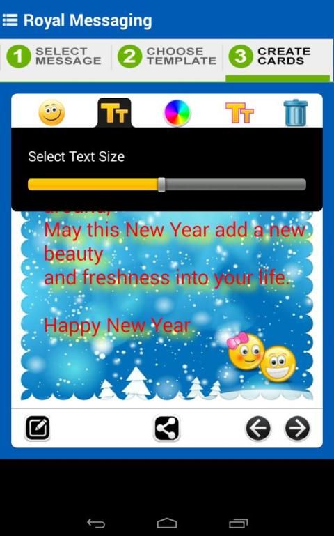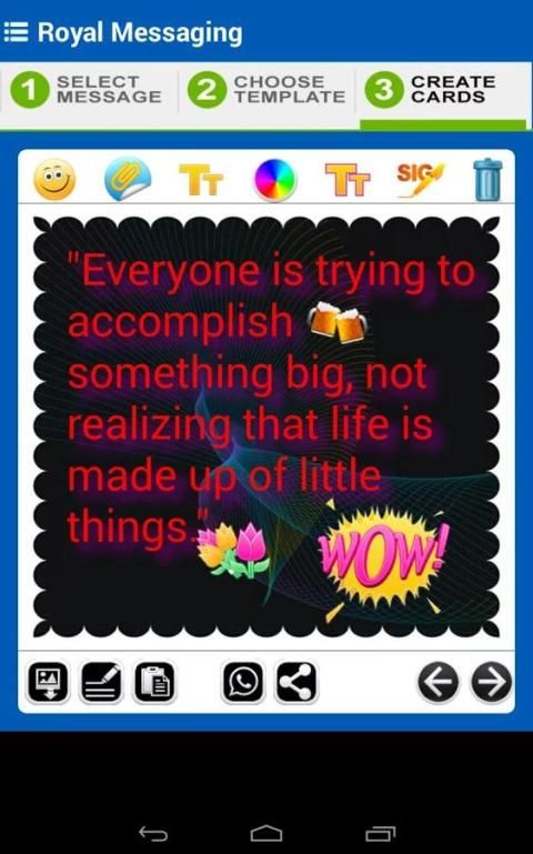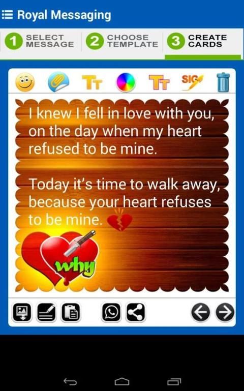 Now you need not to work on writing the messages at all. Just choose the best messages as per your feelings and occassions, select the template, add your icons and stickers and share it with your friends available anywhere like Facebook, whatsapp, email or any existing medium with damn simple interface.