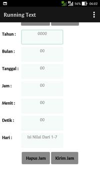 Aplikasi Untuk Merubah Tulisan, Hari, Jam, Tanggal, Bulan, & Tahun Running Text Yang Dibuat Menggunakan Mikrokontroler Arduino dan Module Bluetooth Atau Yang Lainnya.