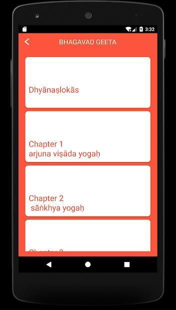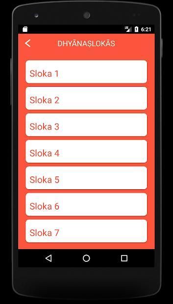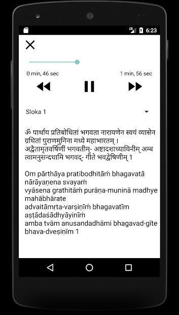 It displays each verse of Bhagavad Geeta accompanied by the audio that is repeated couple of times so that the listener can learn how to chant them properly.