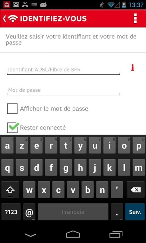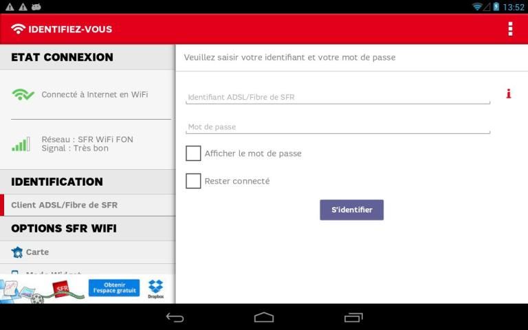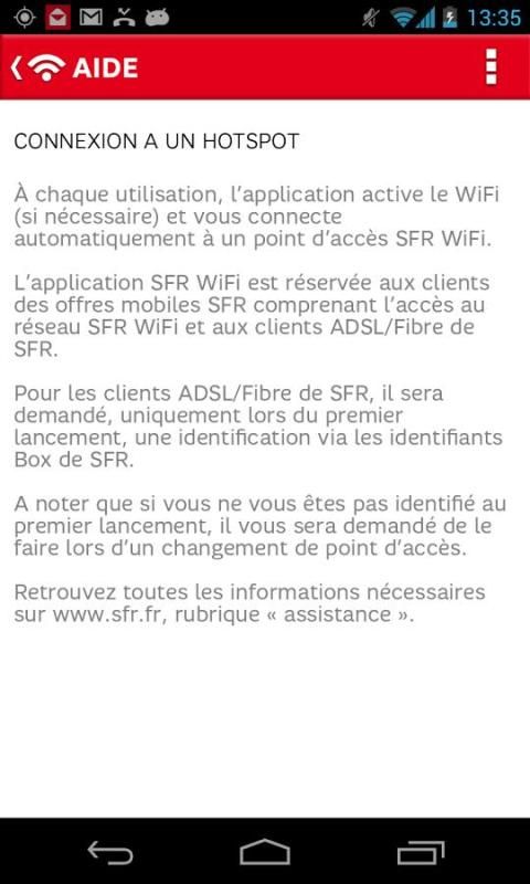 SFR aplikasi WiFi sekarang tersedia untuk pelanggan Box SFR sebagai pelanggan ponsel dengan kartu SIM SFR dengan berlangganan layanan yang memungkinkan akses ke SFR WiFi. Untuk ADSL / serat pelanggan SFR akan diminta hanya bila Anda peluncuran pertama, identifikasi melalui pengidentifikasi Box SFR.