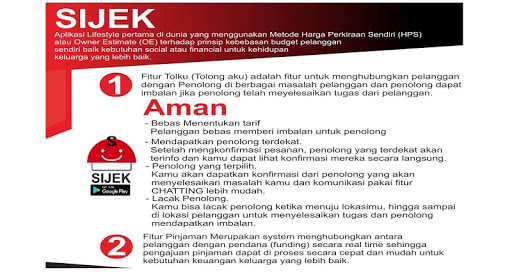 SIJEK Aplikasi Lifestyle pertama di dunia yang menggunakan Metode Harga Perkiraan Sendiri (HPS) terhadap prinsip kebebasan budget pelanggan sendiri baik kebutuhan sosial atau financial untuk kehidupan keluarga yang lebih baik.