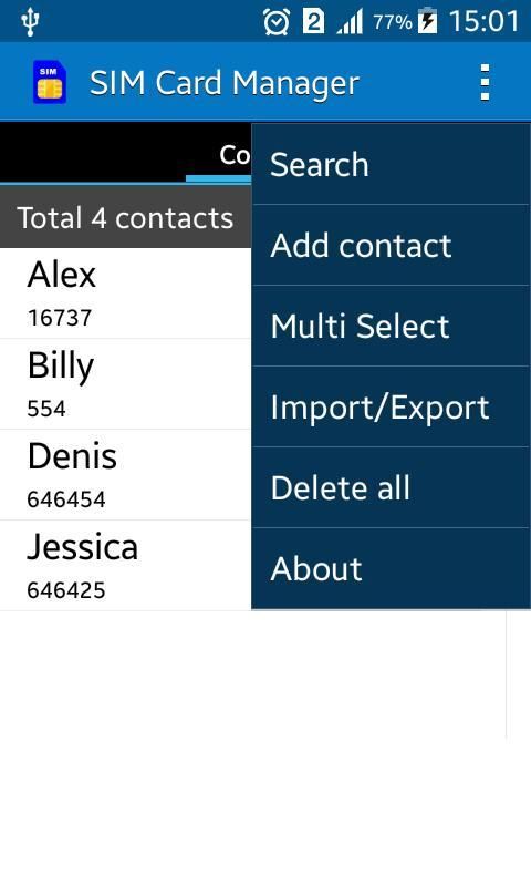 Hal ini juga membantu Anda untuk mengelola kontak di SIM Card Anda, Anda dapat melihat semua kontak Anda yang tersimpan di kartu SIM, membuat kontak baru (toko ke SIM card), memodifikasi kontak atau menghapus kontak (s).