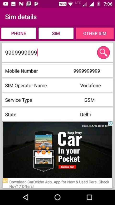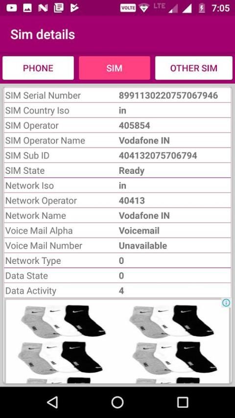 SIM card dan jaringan rincian seperti pelanggan id, operator SIM, SIM seri tidak, SIM nama operator, operator jaringan, jenis jaringan akan tersedia untuk Anda.