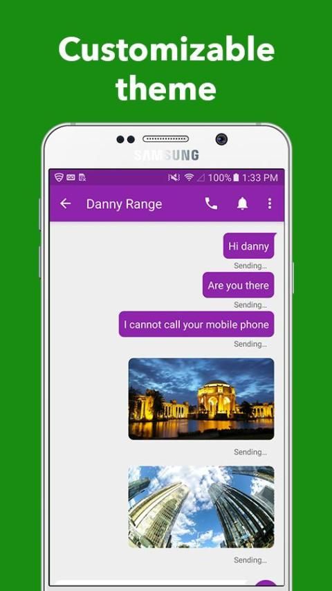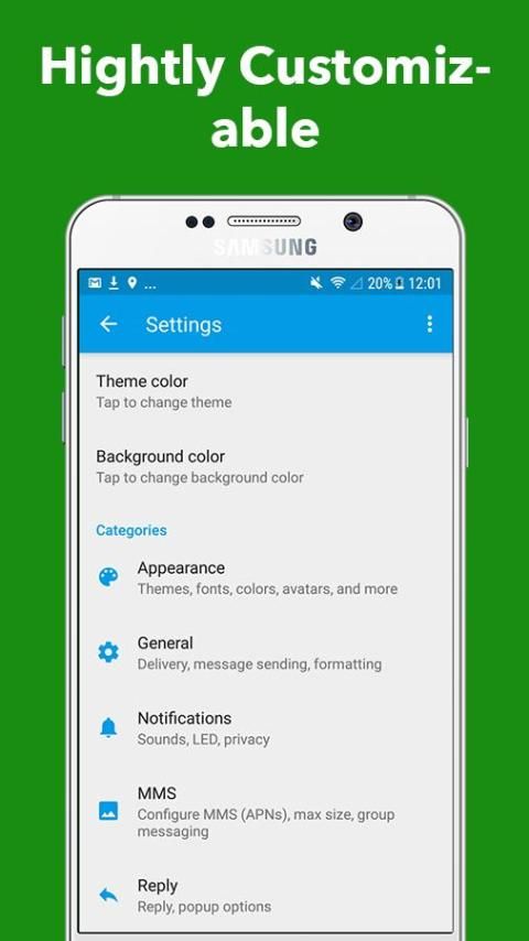 Kustomisasi: Warna dan bentuk pesan gelembung, wallpaper daftar percakapan, ukuran dan gaya masing-masing font, latar belakang, emoticon, emoji, smiley, pilihan suara pemberitahuan ini ... Suasana hati fitur segala sesuatu yang diperlukan untuk SMS sepenuhnya disesuaikan & aplikasi MMS yang menawarkan untuk mengirim teks dan media.