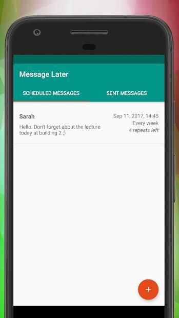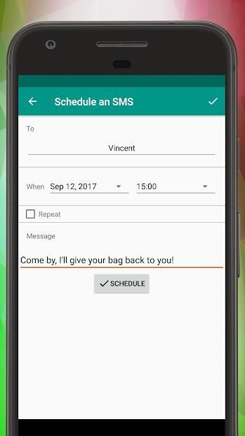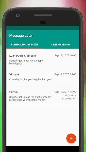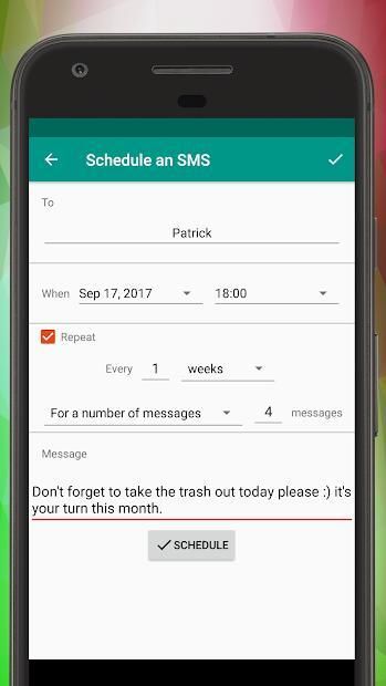 Make the phone send delayed SMS messages for you automatically at the time you want. Do you want to send an SMS message with a delay at a particular time? Schedule it with this message scheduler app! Or maybe you want to schedule some messages to be sent repeatedly as a reminder. This SMS message sender will help you with all that! You might be asleep at that moment, be at the lecture or at a job interview. This app will send the message you ask at the time you ask. The app will also let you schedule messages to be sent multiple times, once in a while (repeatedly). Maybe you want to notify your coworkers every week about cleaning the kitchen? Or text your flatmates to take the trash out once in a while. This SMS sender app will help to schedule and automatically send SMS messages with delay or periodically! Try this free SMS sender and don't forget to leave the review!