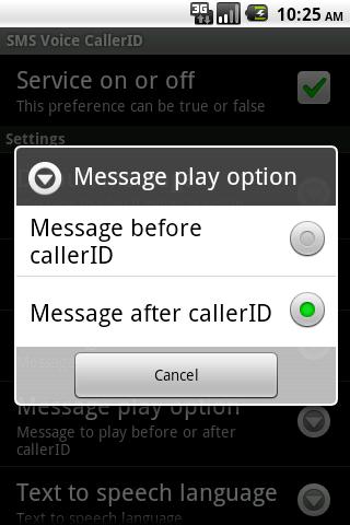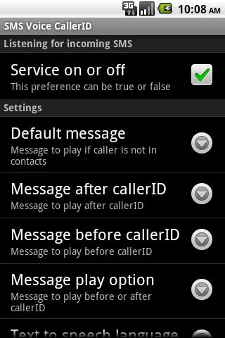 This app use the text to speech engine to speak the caller displayname if in contacts when a sms message coming in.You can write your message as a setting.Before or after the callerID.Activate or discativat the service.Tested on android 2.2NOTICE Disable or choose silent ringtone in the default text message app. And choose your ringtone in the setting page of this app.