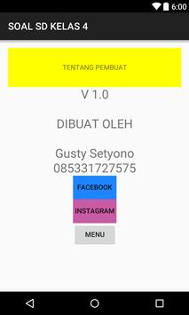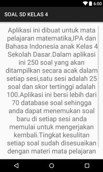 Soal Kelas SD 4 merupakan aplikasi yang berisi latihan soal mata pelajaran Matematika, bahasa Indonesia dan IPA dengan materi pembelajaran untuk Siswa Sekolah Dasar Kelas 4 baik semester 1 maupun semester 2. Dalam aplikasi ini 250 soal yang akan ditampilkan secara acak dalam setiap sesi, satu sesi adalah 25 soal dan skor tertinggi adalah 100. Dengan ini diharapkan siswa mampu terlatih dalam mengerjakan soal matematika, bahasa indonesia dan IPA.