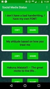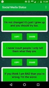 This application is collection of cool social media(whatapp,facebook etc) statuses.Users can use these statuses on their facebook and whatsapp to make good impression on their friends.
