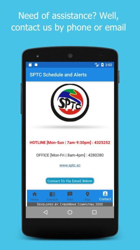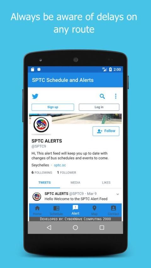Laman lansiran menghubungkan pengguna ke akun twitter yang digunakan oleh SPTC untuk menampilkan alert rute untuk rute yang terkena penundaan karena kerusakan bus atau alasan lain. Aplikasi ini telah dirancang untuk memberikan informasi yang mudah diakses untuk penumpang memanfaatkan bus Seychelles.