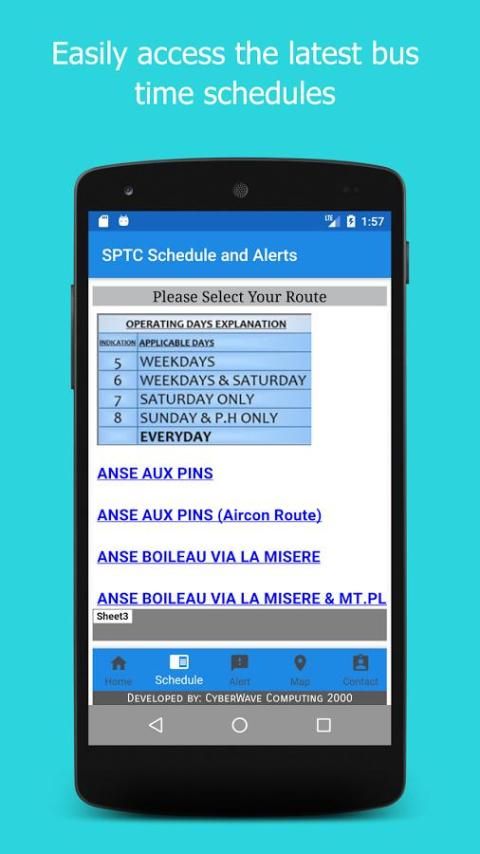 Aplikasi ini menyediakan Seychelles Umum Transport Corporation penumpang dengan informasi terkini Bus jadwal. Hal ini juga memberikan tanda pada rute yang terkena penundaan. Mengklik menu yang tersedia di bar bawah memungkinkan pengguna untuk mengakses Jadwal, tanda, peta yang menunjukkan lokasi stasiun bus utama dan halaman kontak untuk penumpang yang ingin meninggalkan pesan.
