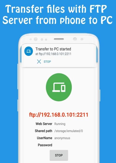 Transfer file dengan FTP Server dari ponsel ke PC. Yang harus Anda lakukan adalah membuka alamat IP di browser dan semua file Anda di ponsel mudah diakses. Anda juga dapat berbagi file dari ponsel Anda menggunakan bluetooth, wifi langsung aplikasi jejaring sosial lainnya dll.