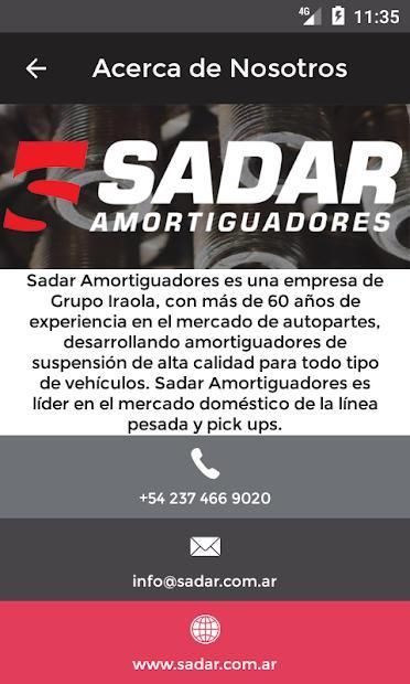 Sadar Amortiguadores adalah perusahaan dengan lebih dari 60 tahun pengalaman di pasar suku cadang mobil, mengembangkan peredam kejut suspensi berkualitas tinggi untuk semua jenis kendaraan. Sadar Amortiguadores adalah perusahaan GRUPO IRAOLA, dibentuk oleh divisi Autopartes, divisi Sepeda Motor, divisi Pertanian, dan divisi Real State.