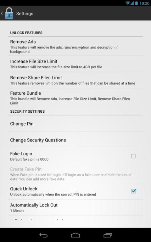 ** Self-delete/remove pilihan informasi pribadi, dalam kasus telepon Anda dicuri atau dalam hal akses tidak sah ke app