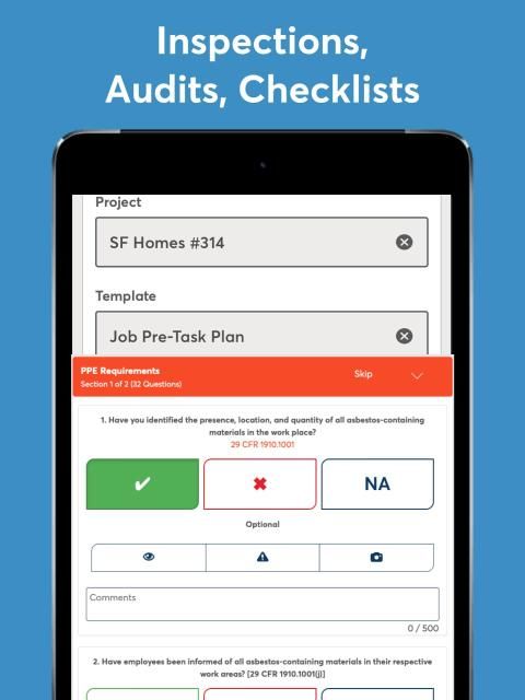 Safesite adalah aplikasi sistem manajemen keselamatan berbasis mobile gratis untuk tim dan individu yang ingin memprioritaskan keselamatan. Sistem manajemen keselamatan kami memungkinkan tim dan individu dengan mudah melakukan inspeksi keselamatan tanpa kertas, audit, laporan kejadian, pembicaraan kotak peralatan, dan lainnya menggunakan aplikasi Safesite. Kelompokkan proyek, wilayah, atau tim Anda untuk merampingkan proyek