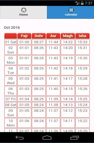 - A schedule of prayer times for the current month.