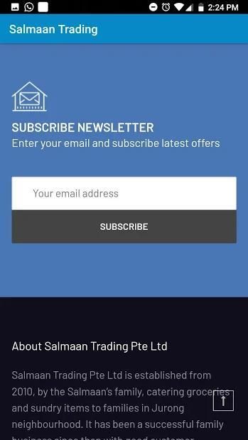Salmaan Trading Pte Ltd didirikan mulai tahun 2010, oleh keluarga Salmaan, katering belanjaan dan berbagai macam barang untuk keluarga di lingkungan Jurong. Ini telah menjadi bisnis keluarga yang sukses sejak daripada dengan umpan balik dan kepuasan pelanggan yang baik. Di tahun 2016, Salmaan Trading Pte Ltd memperluas bisnisnya dengan memberikan pengiriman ke depan pintu dan pada tahun 2018, ia online untuk menjangkau pelanggannya dengan lebih baik dan lebih mudah. Salmaan Trading Pte Ltd memberikan barang dan kepuasan pelanggan.