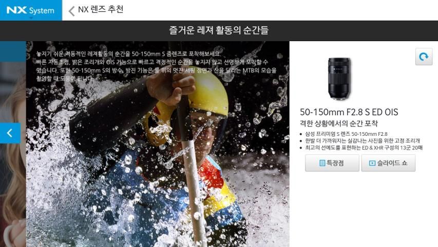 Samsung NX aplikasi kamera pintar adalah tangan-on katalog aplikasi yang menyediakan informasi dan foto yang indah dan video yang sampel up-to-date yang diambil pada setiap produk pada sistem NX.