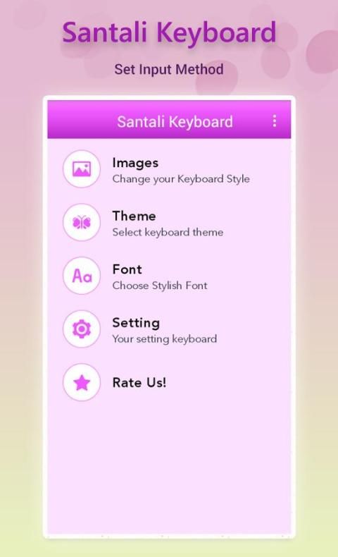 Pilihan yang digunakan untuk menerapkan pengaturan keyboard Santali Anda dengan berbagai options.like Pengaturan Umum, Pengaturan Display, Pengaturan Font, Suara Pengaturan dll pengaturan