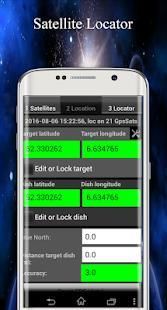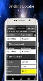 2- The GPS location of the satellite dish and the GPS location of a target (or reference point) is needed. The target can be the GPS location of a house, tree, plant, etc. Just enable the GPS in your phone or enter the GPS locations with the help of Google Earth/Maps (satellite dish position and a visible target position).