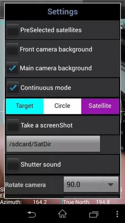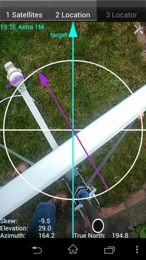 Hanya mengaktifkan GPS di ponsel Anda atau masukkan lokasi GPS Anda, pilih TV lokasi antena Diinginkan atau satelit dan menandai telepon Anda ke langit untuk menargetkan (menemukan) satelit TV. Anda telah menemukan satelit Ketika bola putih dalam lingkaran putih dan bola cyan dalam lingkaran cyan. Menyelaraskan, di azimut, lengan offset parabola ke cyan panah pada layar ponsel dan parabola sejajar di azimuth dengan satelit.