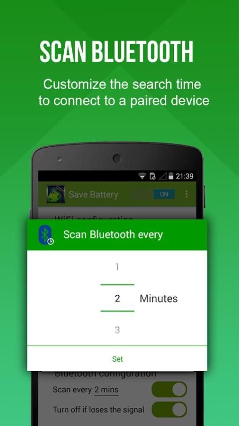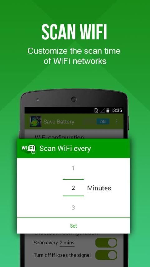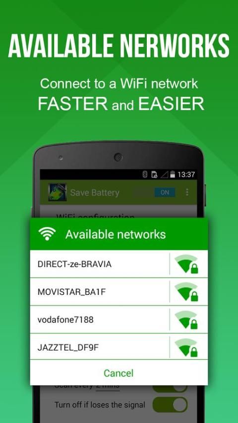 Hemat Baterai ternyata pada WiFi dan memindai beberapa jaringan WiFi dikenal dan secara otomatis menghubungkan jika mungkin, dan ketika kehilangan sinyal, ternyata off WiFi.