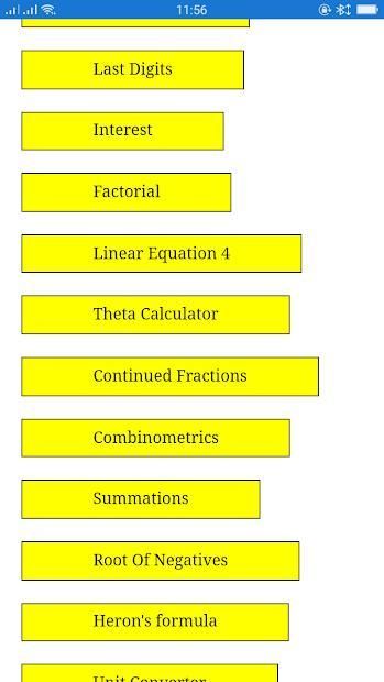 Ada kalkulator untuk masalah teori nomor, sekolah, masalah tingkat perguruan tinggi, termasuk persamaan linear dan kuadrat, determinan, matriks, gcd, lcm, Euler phi dan lain-lain.