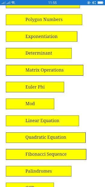 Anda dapat pergi offline dan menghitung n digit terakhir, menghitung dan daftar nomor poligonal, angka palindrome, faktor prima yang berbeda, gcd lebih dari dua angka, bilangan kompleks, fraksi lanjutan, dan lebih banyak lagi konsep yang datang dalam ujian Olympiad dan IIT JEE.