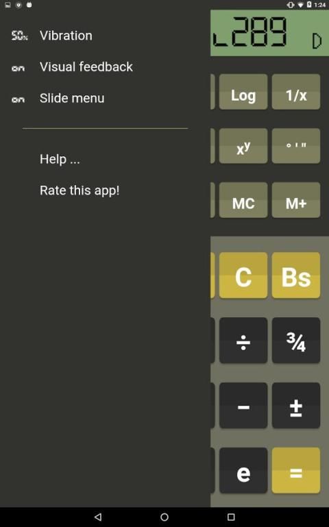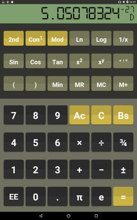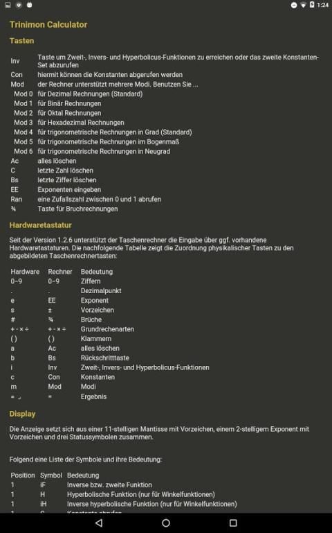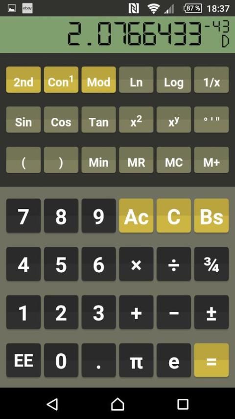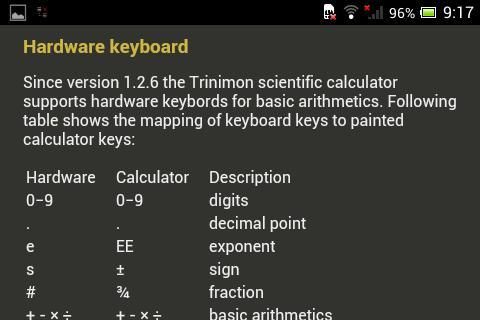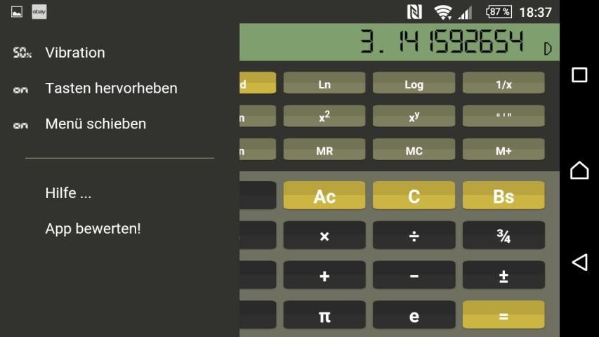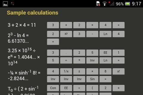 Kalkulator ini memiliki orientasi landscape dan portrait dengan tampilan dan nuansa yang menyenangkan. Berkat tata letak mesin pintar user interface tetap selalu jelas independen dari ukuran layar yang berbeda. Penggunaan sangat mirip dibandingkan dengan kalkulator hardware biasanya. Jika ada merasa bebas untuk menggunakan keyboard fisik Anda. Haptic feedback dan visual yang dapat diaktifkan dalam menu. Kalkulator menawarkan fitur dan fungsi sebagai berikut: