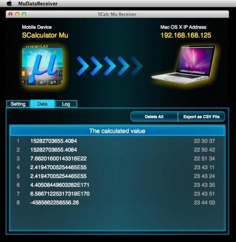 The transmitted data is all stored in the 'SCalc mu Receiver' and you can export to CSV file.