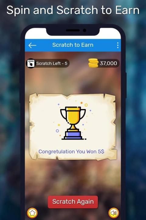 Aplikasi Scratch and Spin to win memberi Anda untuk menggores roda putar kartu Anda dan memenangkan uang nyata pada perangkat android untuk melakukan tugas awal, roda putaran dan desain terbaik yang pernah ada dengan antarmuka pengguna dan desain grafis.