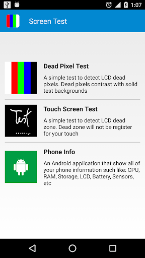 Features: * Dead pixels detection: A simple test to detect LCD dead pixels. It contrast with solid test backgrounds. * Screen touch test: A simple test to detect LCD dead zone. Dead zone will not be register for your touch.