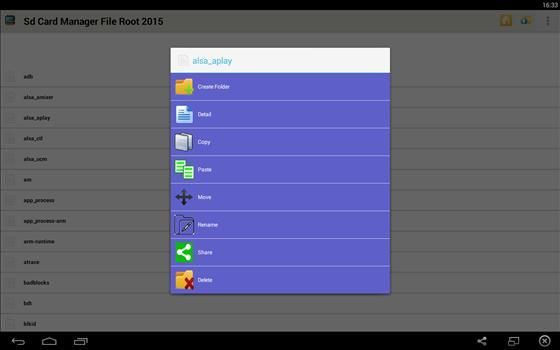 remove and share files Holo Light styles for Android Browse folders and files in root memory and sdCard Explore you local Android root file system and SD cards both List view UI