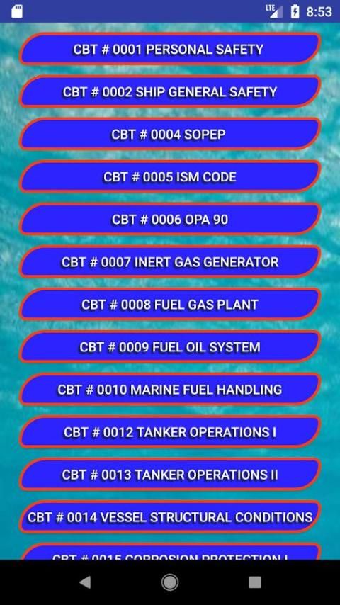 CBT # 0001 Keamanan Pribadi, CBT # 0002 Kapal Keselamatan Umum, CBT # 0004 SOPEP, CBT # 0005 ISM Code, CBT # 0006 OPA 90, CBT # 0007 Inert Gas Generator, CBT # 0008 Bahan Bakar Gas Plant, CBT # 0009 Sistem Bahan Bakar Minyak , CBT # 0010 Marine Fuel Handlingm CBT # 0012 operasi Tanker I, CBT # 0013 operasi Tanker II, CBT # 0014 Vessel Kondisi Struktural, CBT # 0015 Korosi Perlindungan I, CBT # 0016 Korosi Perlindungan II, CBT # 0017 Steering gear, CBT # 0018 Cooling System, CBT # 0019 remote Control System, CBT # 0020 SAR, CBT # 0021 GMDSS, CBT # 0022 Maritime Inggris, CBT # 0024 operasi Auxilary Diesel Engine, CBT # 0026 Voyage Perencanaan, CBT # 0027 Ballast Manajemen, CBT # 0029 Hull dan Mesin, CBT # 0030 Kelautan Pelumas, CBT # 0031 Pusnes ETS, CBT # 0032 Cargo Properties, CBT # 0033 Stabilitas, CBT # 0034 AC4, Gubernur Sistem Digital, CBT # 0035 Inspeksi, CBT # 0036 Medis Pertolongan Pertama, CBT # 0040 Maritime Inggris, CBT # 0041 Generator, CBT # 0043 Bilge Air Separator, CB T # 0045 Kontainer Glamor-Basic, CBT # 0046 Auxiliary Boiler Plant, CBT # 0047 Bahan Bakar Pembakaran Efisiensi, CBT # 0048 Pengukuran Gas, CBT # 0049 Radar Observasi dan Plotting, CBT # 0050 ARPATheoryCBT # 0051 Pengantar NavigationCBT # 0053 HAZMATCBT # 0054 SAPI, CBT # 0055 ODME, CBT # 0056 Penilai Pelatihan, CBT # 0057 Doppler Log, CBT # 0058 COLREG, CBT # 0059 DGPS, CBT # 0060 Navigasi di Ice, CBT # 0061, CBT # 0063, CBT # 0064, CBT # 0066, CBT # 0068, CBT # 0069, CBT # 0070, CBT # 0072, CBT # 0073, CBT # 0074, CBT # 0078, CBT # 0082, CBT # 0083, CBT # 0087, CBT # 0088, CBT # 0089, CBT # 0091, CBT # 0092, CBT # 0093, CBT # 0094, CBT # 0095, CBT # 0096, CBT # 0097, CBT # 0098, CBT # 0099, CBT # 0101, CBT # 0102, CBT # 0103, CBT # 0104, CBT # 0109, CBT # 0110, CBT # 0111, CBT # 0112 CBT # 0115, CBT # 0116, CBT # 0117, CBT # 0118, CBT # 0121, CBT # 0122, CBT # 0123, CBT # 0125, CBT # 0127, CBT # 0130, CBT # 0131, CBT # 0132, CBT # 0133, CBT # 0134, CBT # 0142, CBT # 0143, CBT # 0144, CBT # 0145, CBT # 0146, CBT # 0147, CBT # 0149, CBT # 0150, CBT # 0151, CBT # 0152, CBT # 0155, CBT # 0156, CBT # 0157, CBT # 0158, CBT # 0160 , CBT # 0161, CBT # 0162, CBT # 0163, CBT # 0164, CBT # 0165, CBT # 0166, CBT # 0167, CBT # 0168, CBT # 0169, CBT # 0170, CBT # 0172, CBT # 0173, CBT # 0174, CBT # 0175, CBT # 0176, CBT # 0177, CBT # 0179, CBT # 0181, CBT # 0186, CBT # 0187, CBT # 0190, CBT # 0191, CBT # 0192, CBT # 0193, CBT # 0194 , CBT # 0195, CBT # 0196, CBT # 0197, CBT # 0211, CBT # 0212, CBT # 0213, CBT # 0215, CBT # 0216, CBT # 0217, CBT # 0218, CBT # 0220, CBT # 0221, CBT # 0250, CBT # 0251, CBT # 0252, CBT # 0253, CBT # 0254, CBT # 0255, CBT # 0256, CBT # 0257, CBT # 0300, CBT # 0301, CBT # 0600, CBT # 0601, CBT # 0602 , CBT # 0604, CBT # 0605, CBT # 0606, CBT # 0608, CBT # 0612, CBT # 4010, CBT # 4011, CBT # 7001, CBT # 7002, CBT # 7003, CBT # 7004, CBT # 7005, CBT # 7006, CBT # 7007, CBT # 7008, CBT # 7009, CBT # 7010, CBT # 7011, CBT # 7012, CBT # 7013, CBT # 7 014, CBT # 7015, CBT # 7016, CBT # 7017, CBT # 7020, CBT # 7021, CBT # 7022, CBT # 7023, CBT # 7024, CBT # 7025, CBT # 7026, CBT # 7027, CBT # 7028, CBT # 7029, CBT # 7030, CBT # 7031, CBT # 7032, CBT # 7033, CBT # 7034, CBT # 7035, CBT # 7040, CBT # 7041, CBT # 7042, CBT # 7043, CBT # 7044, CBT # 7045, CBT # 7046, CBT # 7047, CBT # 7048, CBT # 7049, CBT # 7050, CBT # 7051, CBT # 7052, CBT # 7053, CBT # 7054, CBT # 7055, CBT # 7056, CBT # 7057, CBT # 7058, CBT # 7059.