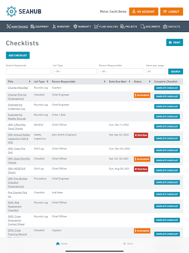 - daftar periksa termasuk putaran ruang mesin, keamanan & amp;Daftar Periksa Kebakaran