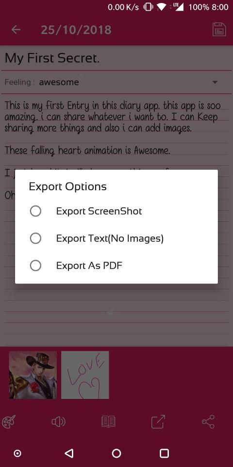 A Diary selalu menjadi sahabat semua orang. Dan jika ada kunci di atasnya untuk melindunginya maka Best Diary For Them. Anda dapat Menyimpan Apa Pun untuknya dan Akan Tetap Menyimpannya selamanya. Anda juga dapat mencadangkan entri buku harian Anda ke Google Drive Anda dengan mudah jadi Jika Anda ingin mengganti ponsel, Anda dapat melakukannya.