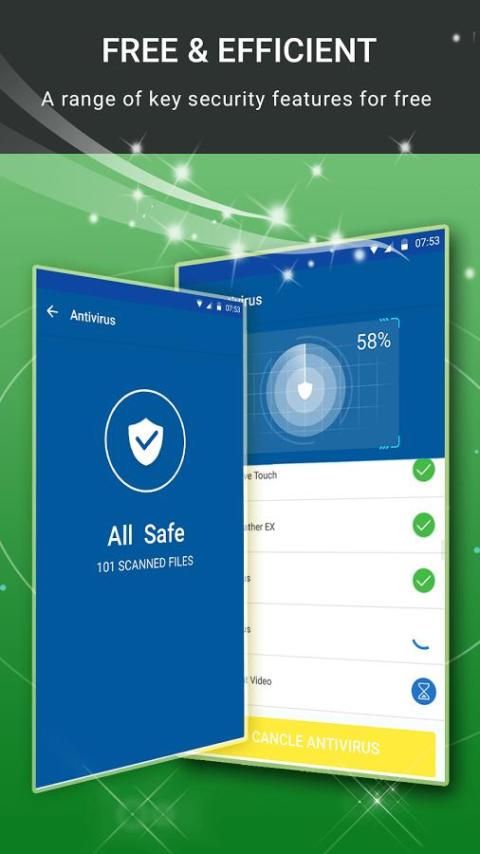 Memindai aplikasi diinstal, konten kartu memori, dan aplikasi baru secara otomatis. Keamanan aplikasi teknologi perlindungan terbaru terhadap virus, adware, malware, trojan dan banyak lagi.
