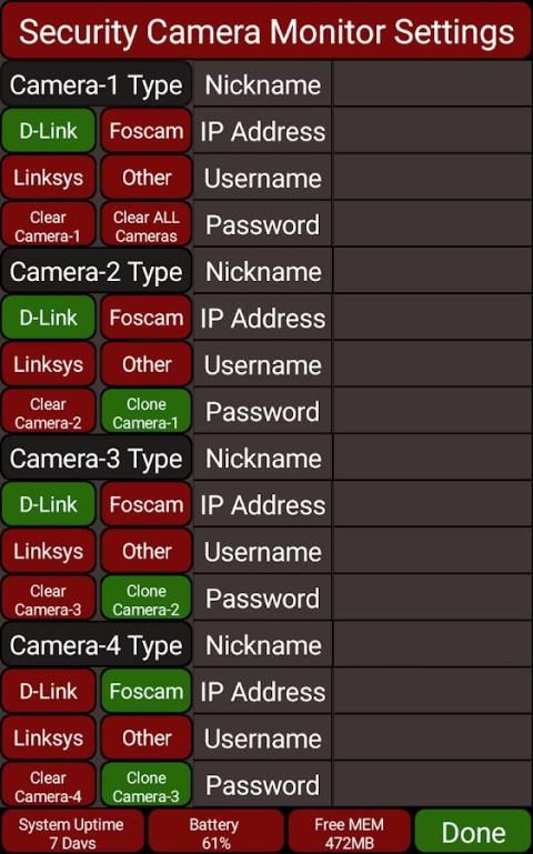 * Kebanyakan Kamera IP menggunakan URL unik untuk mengakses feed video langsung, dan dapat bervariasi dengan membuat berbeda dan model. jenis kamera yang telah ditetapkan Security Camera Monitor membutuhkan setiap kamera dikonfigurasi untuk menanggapi URL tertentu untuk mencapai pakan hidup dan mengambil snapshot dari JPG gambar diam. Untuk pengguna tingkat lanjut, adalah mungkin untuk mengesampingkan jenis kamera yang telah ditetapkan dan masukkan URL setiap dengan memilih jenis kamera "lainnya".