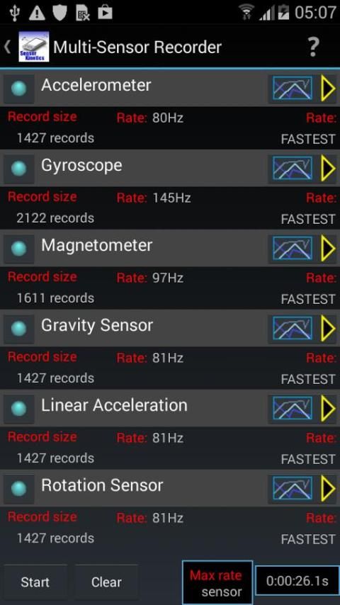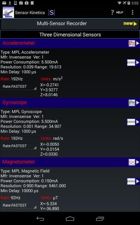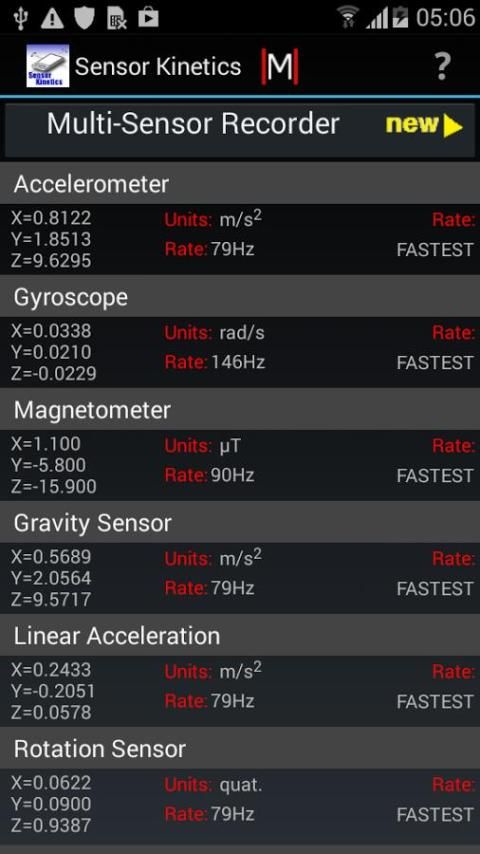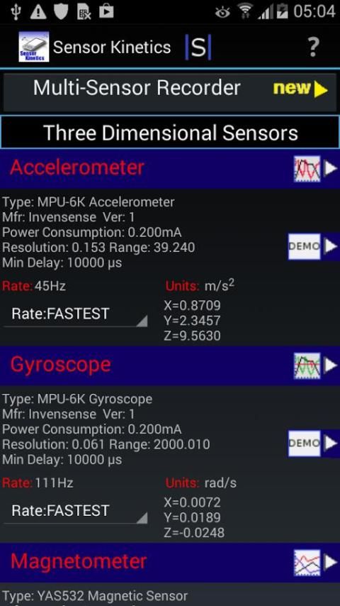Gunakan Sensor Kinetics untuk memantau dan memahami perilaku sensor saat Anda mengubah pengaturan delay atau mengaktifkan / menonaktifkan sensor tertentu. Setiap sensor terpasang ke grafik penampil canggih. Multi-Sensor Recorder mencatat beberapa sensor secara bersamaan pada data rate dikontrol. Jika Anda perlu untuk menyimpan atau berbagi grafik sensor, silahkan membeli pendamping Sensor Kinetics Pro. Versi Pro juga iklan gratis.