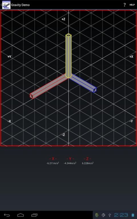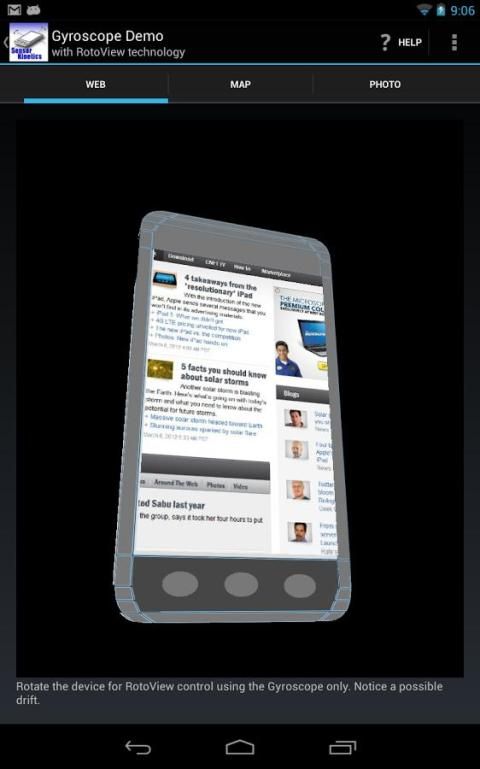 Aplikasi ini menunjukkan penggunaan accelerometer, gyroscope dan sensor rotasi untuk mengendalikan berdasarkan tilt tampilan navigasi seperti teknologi RotoView oleh Innoventions. Hal ini juga menunjukkan operasi dari sensor magnetik, sensor percepatan linear dan sensor gravitasi dalam tampilan grafis khusus.