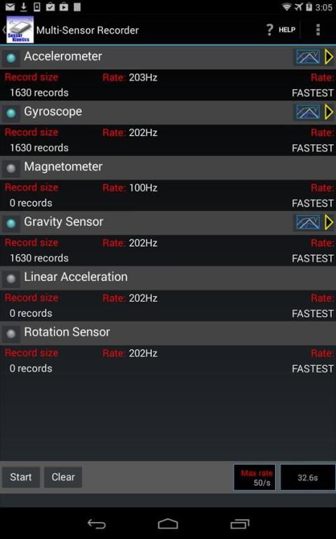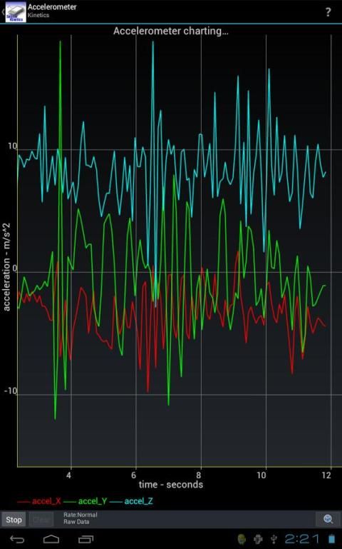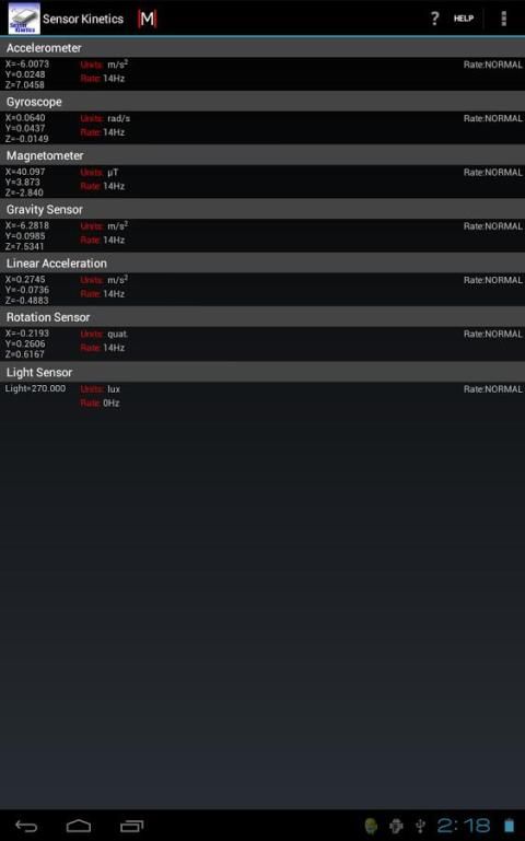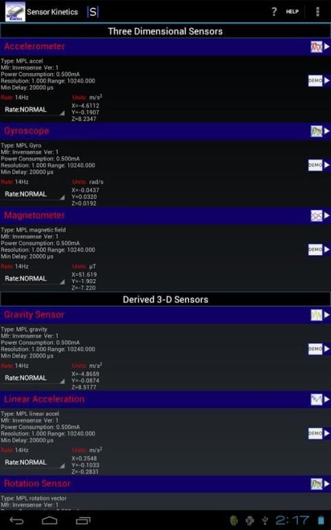 Menguji ponsel Android atau tablet: Sensor Kinetics memungkinkan Anda untuk menguji semua sensor pada perangkat Anda. Sebagai contoh, Anda dapat dengan cepat menentukan apakah perangkat Android Anda memiliki sensor giroskop dan seberapa cepat itu beroperasi. Berbagai grafik pemirsa memungkinkan Anda untuk mengukur sensor setiap waktu ke waktu dan mengukur akurasi dan perilaku mereka.