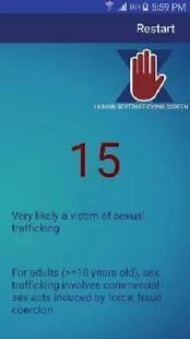 SexTraff was designed by two physicians to be a screening tool used by healthcare professionals. Use of this application will help them discern patients at risk for being sexual trafficking victims. Healthcare professionals are very likely to be the ones that first identify victims. This app separates victims under 18 years of age from those 18 years of age or older. By answering questions about the index patient, a sum of points will be indicated. A total of eight or more points indicates that the patient is at significant risk for being trafficked. The professional should call the indicated human trafficking hot line for help and the local police department. Patients under 18 years of age with 8 or more point totals should be referred to local child protective services as well as the local police department. Patients with borderline totals likely need further evaluation by a professional with expertise in human sex trafficking.