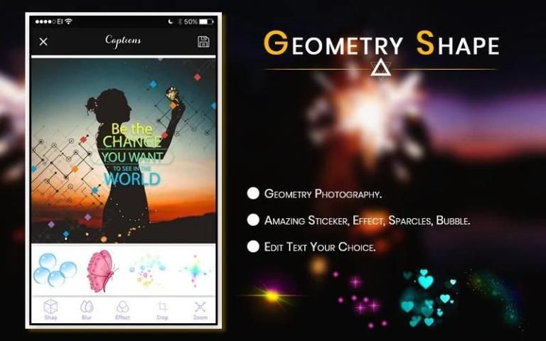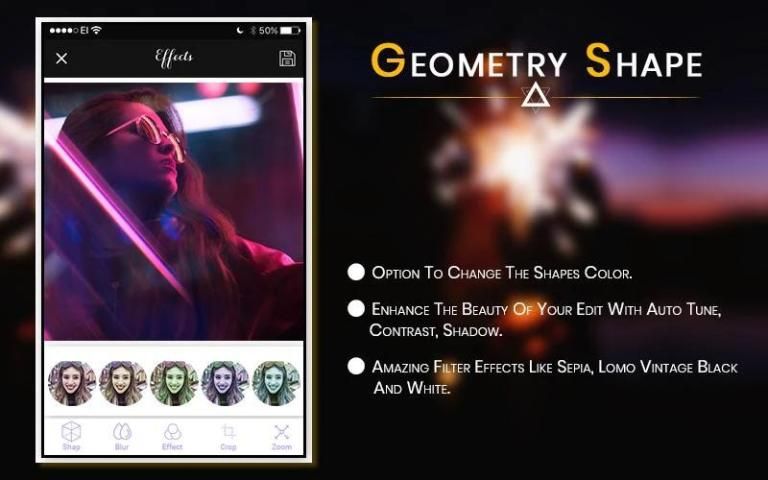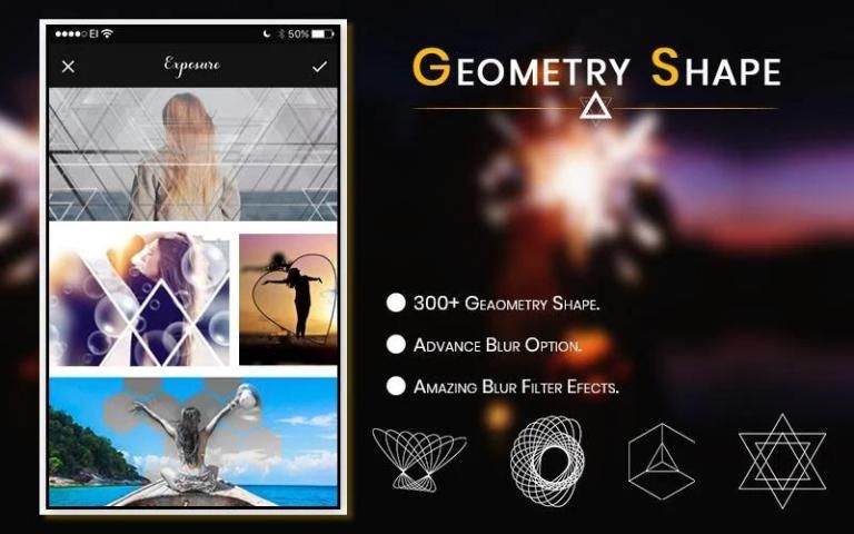 Give a creative look to every one of your pictures utilizing Overlay. Include custom typography, wonderful format covers, and exquisite stickers and Give another look to your most loved photos by applying custom shapes, examples, impacts and channels to it. Geometric Shapes Photo Editor - Geometry Camera and