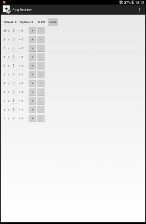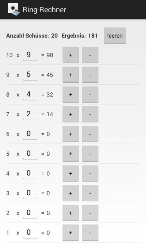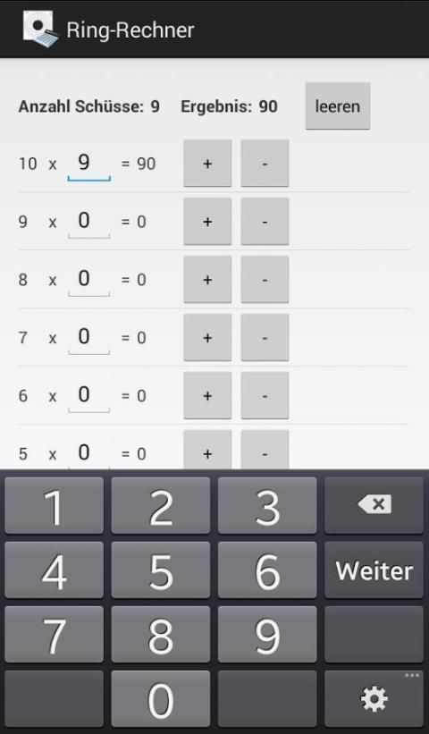 Hasilnya dapat dikirim melalui plus dan tombol dikurangi atau melalui nomor input keyboard untuk setiap cincin - dimasukkan (0 10). Cincin-kalkulator menampilkan jumlah hits masuk, hasil dan rata-rata. Hasilnya dapat disalin melalui menu ke clipboard. Dengan "kosong" tombol, input reset.